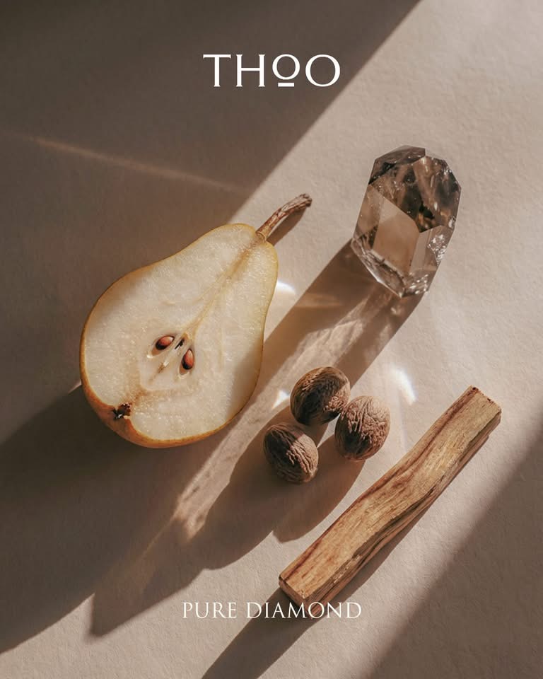 Une élégance contemporaine à l’éclat intemporel. Elle s’ouvre sur la fraîcheur croquante et cristalline de la poire, enveloppée d’un soupçon de muscade, de cannelle et de poivre rose qui en rehausse l’éclat. Au cœur s’épanouit la note veloutée du SACROSANTOL® — crémeuse, ronde et irisée. Une précieuse molécule issue du bois de santal : naturelle, durable et intrinsèquement lumineuse. Sa structure chimique, remarquablement proche de celle du diamant, amplifie son caractère pur et radieux. Le fond se fond enfin dans le charme intemporel de l’ambre gris, enveloppant la composition d’une aura profonde, magnétique et immortelle.